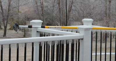 The sun came out Saturday morning, but it stayed cold. The only ice that came off the trees blew away with the wind. Not much melting went on, even with the sun out. The deck was lined with icicles as was Mr. Long Arm®, the telescoping brush we use for getting snow off the satellite dishes and solar panels.